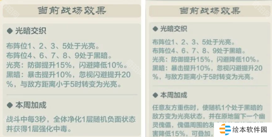 分两种:一个赛季固定一个本周加成,赛季固定的感觉有点针对目前的舞狮阵容三前排三后排。本周加成,每周都会更新,各位大侠需要注意。