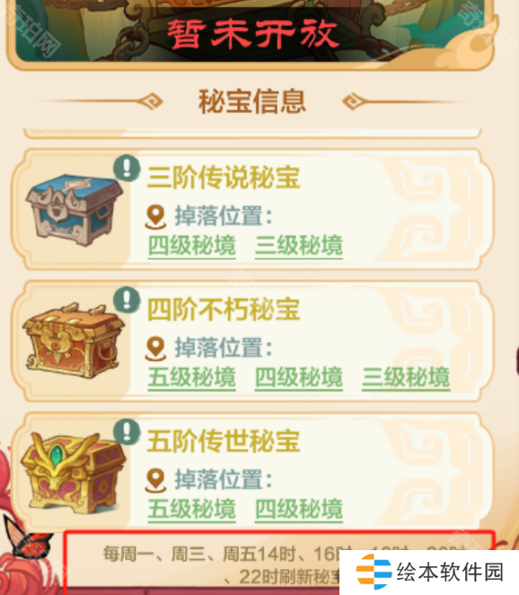 占领秘境秘宝可获得大量丹药,每个秘宝下都有对应的掉落位置,小伙伴们只需在开放期间(周一三五14点、16点、18点、20点、22点)去对应秘境找到秘宝占领。