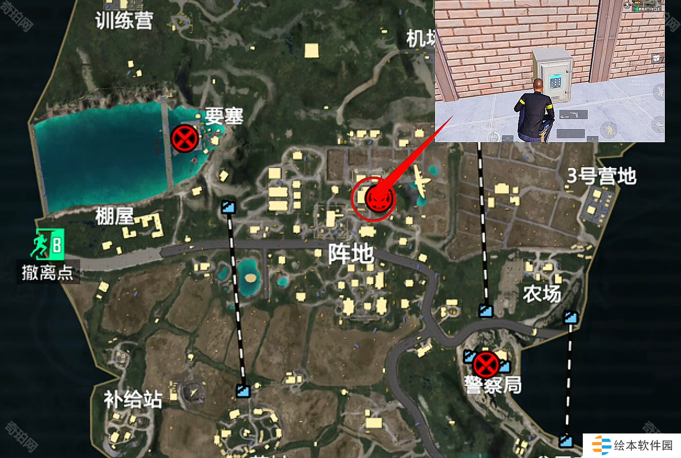 ①阵地地图中间,在砖墙边可以看到