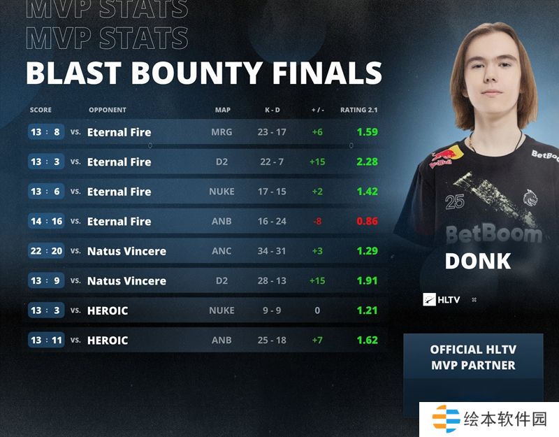 本次BLAST赏金赛S1赛事上,donk在共计8张地图的比赛中砍下1.52的平均Rating,在决赛对阵Eternal Fire的图三Dust2上,donk狂砍最高2.28的Rating。此外在对阵Natus Vincere的图一的Dust2上,他也带领队伍以1.91的Rating拿下胜利。值得一提的是只有在对阵Eternal Fire的图一Anubis上他发挥不佳,Rating小于1.0只有0.86。除了Rating榜单以外,donk还在总击杀数、助攻数、多杀回合数、爆头数、影响力Rating等多个数据占据榜首。