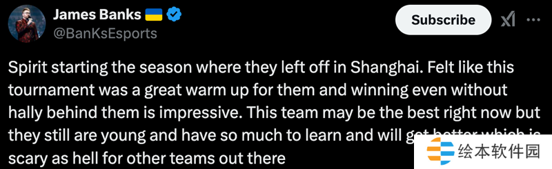 “在以胜利者的姿态离开上海后,Spirit又踏上了新赛季的征程。我觉得这次比赛对他们而言是一次很好的热身。即便是在主教练hally缺席的情况下也能获得胜利,令人印象深刻。这支队伍可能是目前最强战队,但他们也都很年轻,还有很多东西要学,而且只会越来越好,这会让其他队伍感到恐惧。”