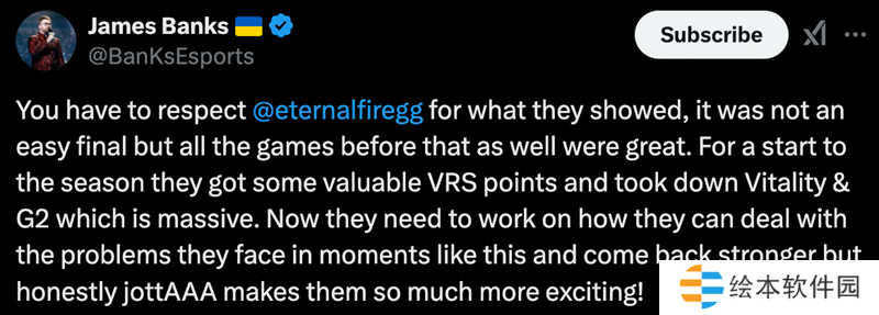 Eternal Fire战队夺得BLAST 赏金赛S1冠军后,知名主持人BanKs在个人社交媒体账号上分享了对这支队伍的看法。
