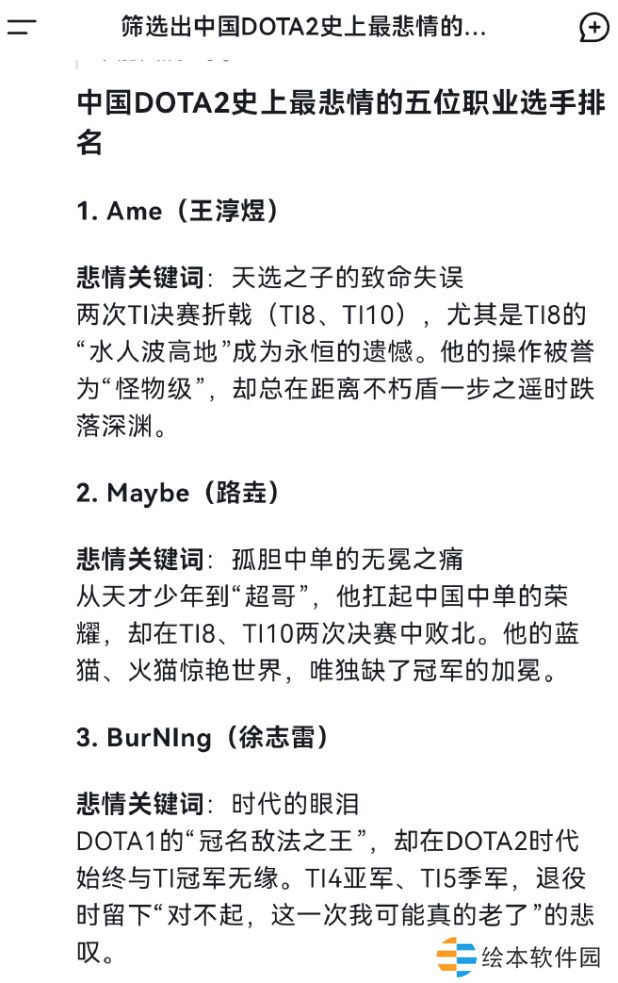 DeepSeek筛选中国DOTA2历史上最悲情职业选手: