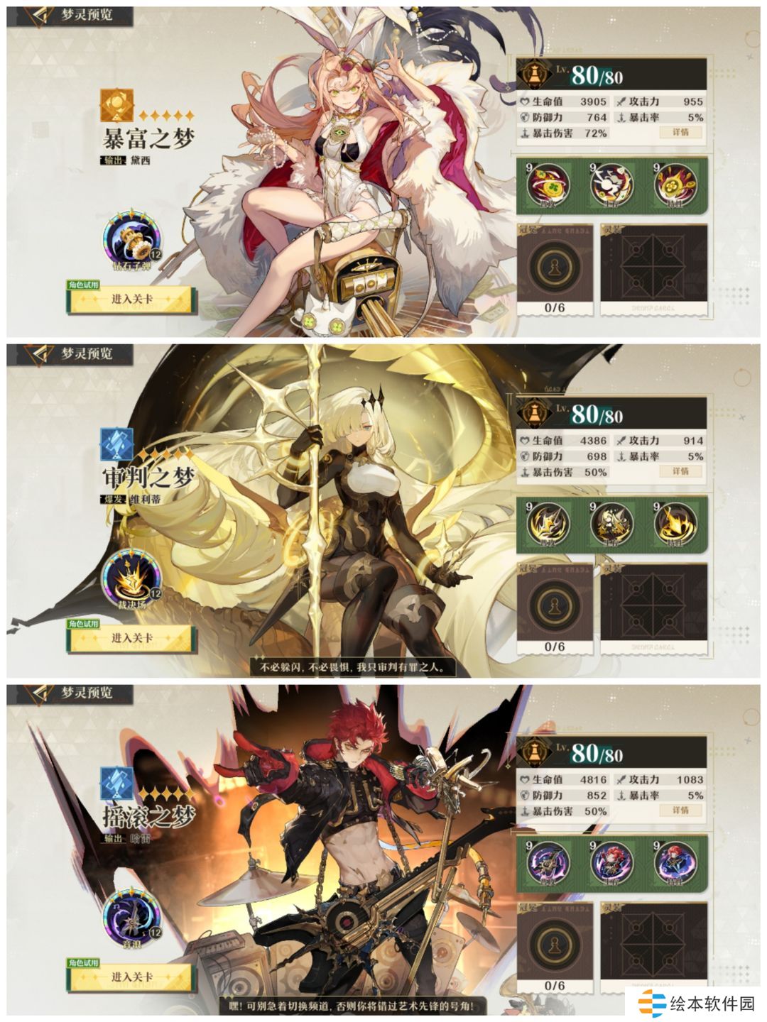 有摇滚之梦的话就不补英雄之梦了,还是审判之梦玩普攻法阵流,审判放后台协攻暴富之梦跟摇滚之梦的普攻。