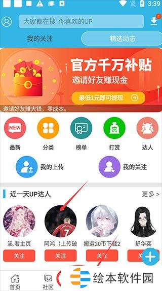 1、首先在本页面下载安装好软件,进入到主页面选择“up”功能按钮,然后点击进去找到达人排行,选择如图所示的达人。