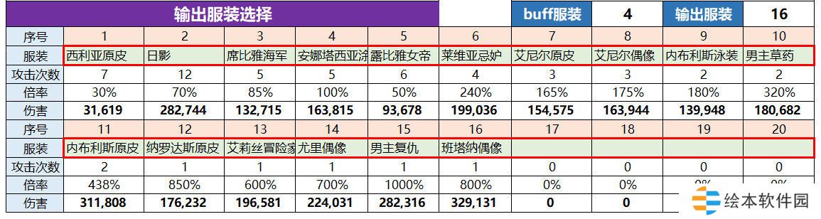 3.自buff技能只影响当前技能的伤害,也就是说每个衣服等于一个独立的人!同一个角色多个衣服的多个自buff不能角色共享(男主、西利亚之类的)。