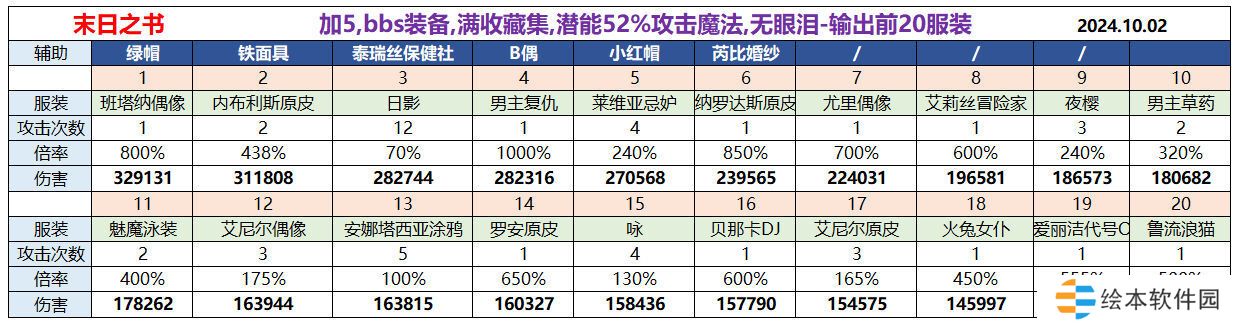 如果这些服装都没有或者未加5,请使用下文的 末日之书计算器,自动计算输出前20服装。