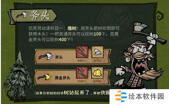 饥荒劳动课科目一:撸树!用斧头把树砍倒即可获得木头!一把普通斧头可以砍树100下,而黄金斧头可以砍树400下!