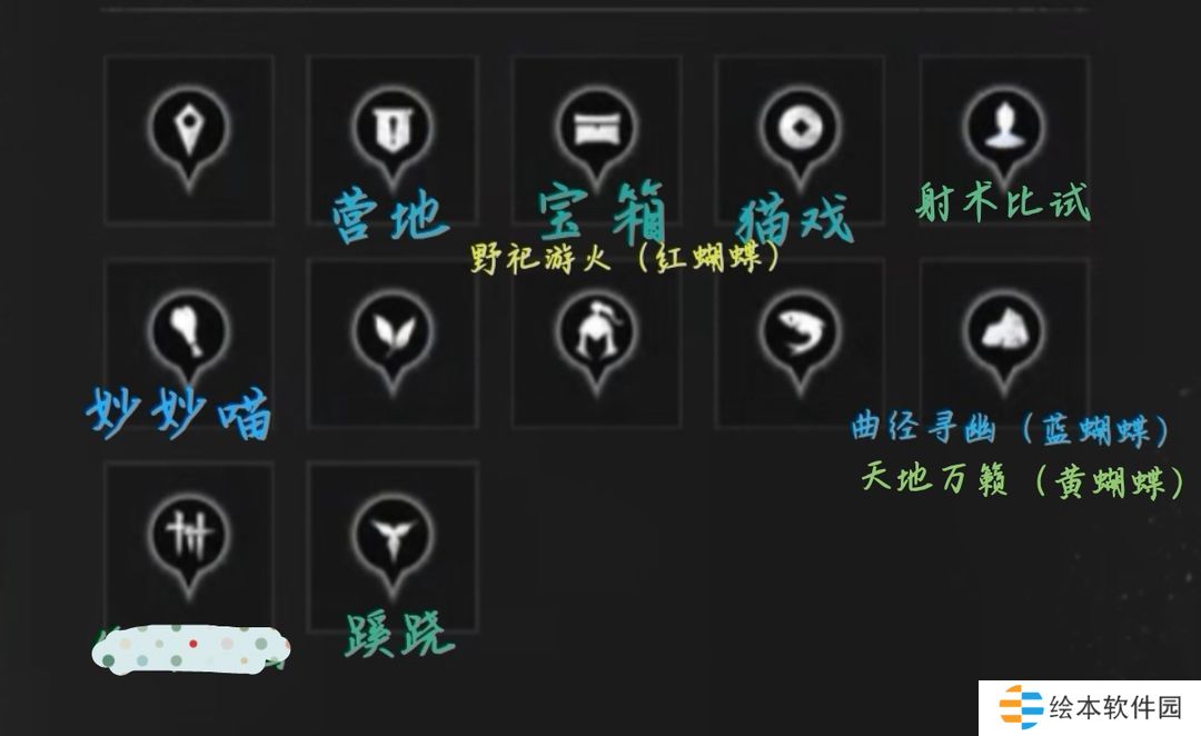 蹊跷、妙妙喵、猫戏、营地、天地万籁、野祀游火、以武会友、悬壶治疗、话术论道、丝竹雅韵、投壶雅戏、射术比试