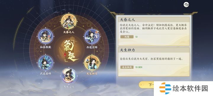开局:选天生神力(+10%攻击力)天眷之人(+10机缘挖宝专用ps:还会加暴击率。)为什么不选:炼丹师不如直接买,每天只能吃一个(太弱了,建议直接改成一天能吃三个) 剩下两个战力不如10%攻击力来的划算。魅力推图没有太大用。