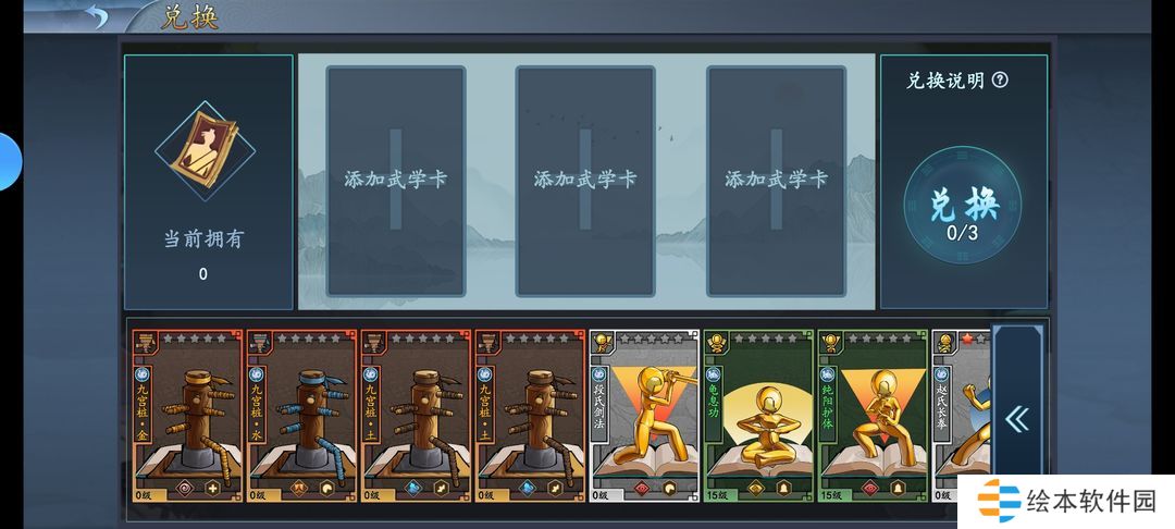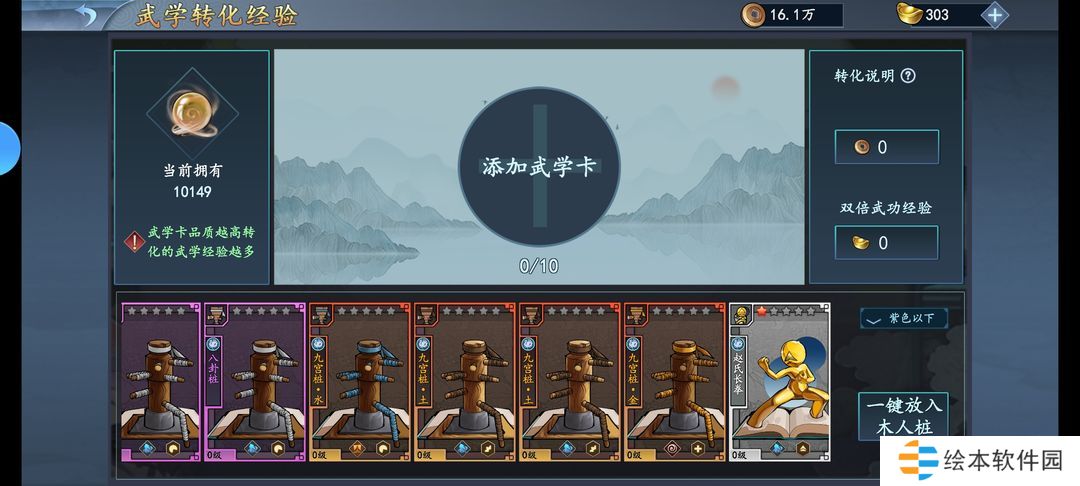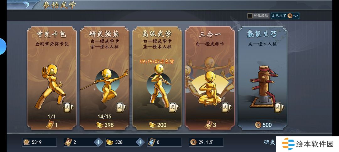 @右下角可以看卡池里具体有啥。目前卡池出 武学 和 桩子 两种卡,桩子不能打架,除了金桩子攒三个一样的换三合一卡券,其它都换成经验给武学卡升级。