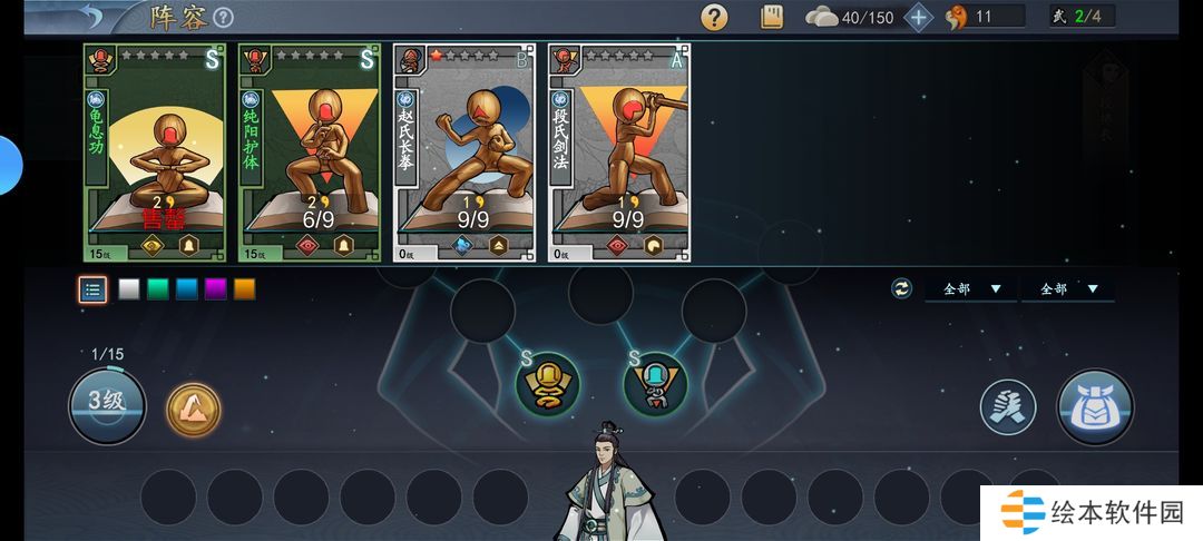 @比如我抽到的纯阳护体被我养到15级,它的属性就高点。左下角显示它是15级,别的我没有的就显示是0级