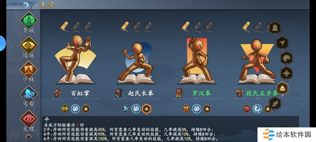 @左下角你选择的属性,开局先换这个,比如我抽到的卡是龟息功和纯阳护体,都是逍遥流派土属性强的卡,所以我经常把它换成土属性,当然,想玩啥玩啥。研武右下角的武学图鉴里可以发现逍遥的武学卡牌大多是金和土,少林是金和水。目前3区榜上大家常玩少林,少量丐帮,还有啥都玩的,然后我玩下来感觉逍遥也挺强的。
