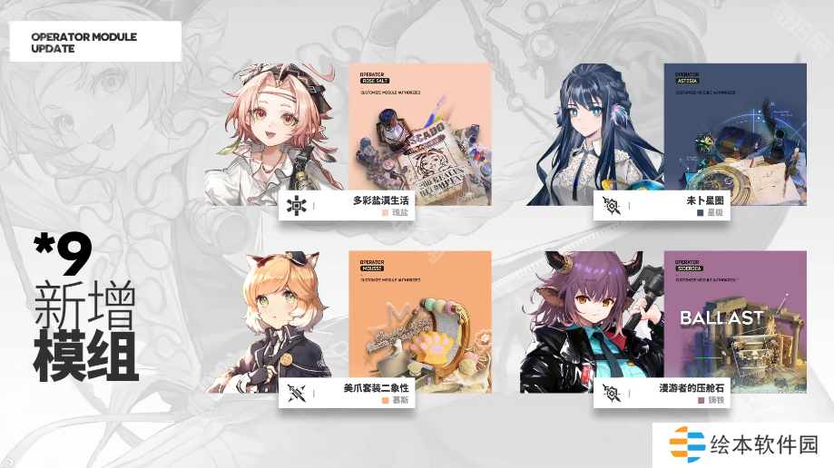 答:本次将新增9个模组,分别为史尔特尔-萨米的不灭心脏碎片、薇薇安娜-目不能及之处、维娜·维多利亚-城主的冒险、阿米娅(近卫)-待调弦的怒火、瑰盐-多彩盐漠生活、星极-未卜星图、慕斯-美爪套装二象性、铸铁-漫游者的压舱石、能天使-欢迎光临,企鹅物流