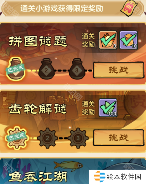 玩法很简单,拼图+拼齿轮+大鱼吃小鱼,每个玩法下都有不同的关卡,每完成一关会获得对应的奖励。全部通关后会获得丹火契,可以去秘宝商店兑换道具。