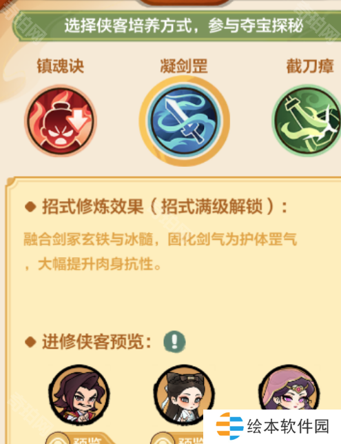 利用秘宝获得的丹药,给赛季侠客升级。有三大类,每一类多对应的效果和侠客各不相同,小伙伴们在选择的时候需要根据自身所玩流派进行选择,比如剑气刀就选择百灵儿……