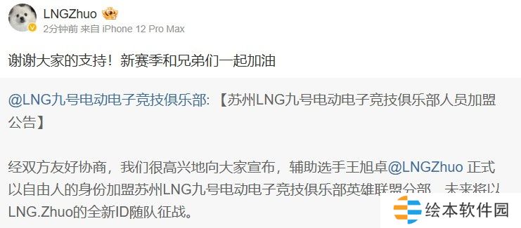 直播吧12月12日讯 Zhuo选手转发LNG人员变动公告,并配文:谢谢大家的支持!新赛季和兄弟们一起加油!