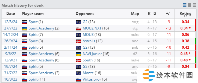 donk6-17-1140.20.36其中0.36 Rating为donk加入Spirit之后的生涯第二低,他生涯最低Rating为0.34 Rating,是在IEM科隆2024 A组败者组首轮对阵