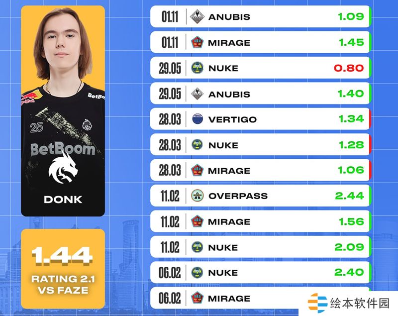 donk在今年对阵FaZe的比赛中都保持着极佳的手感,FaZe似乎始终无法找到遏制这位新星的有效办法。donk今年对阵FaZe的平均数据Rating高达1.44,其中在IEM 卡托维兹的决赛中更是打出了极为夸张的1.96 Rating。