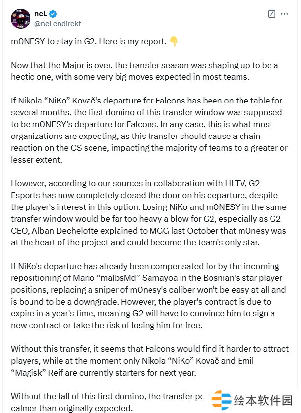 尽管沙特俱乐部Falcons对这位俄罗斯选手表现出了浓厚兴趣,且正在完成与NiKo的签约,但m0NESY似乎并不会在这个转会季离开G2。