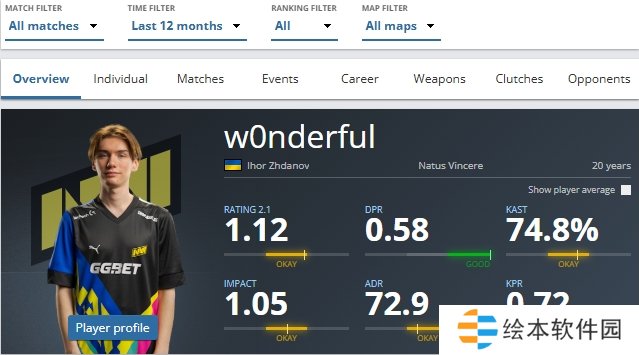 个人数据方面,w0nderful在过去一年中打出1.12 rating的表现。