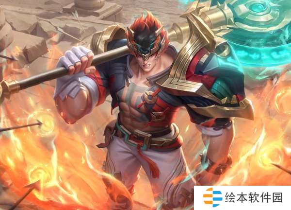 红色短发似熊熊火焰,手持能量四溢的巨斧,身着东方幻想风格的铠甲,腹部八块腹肌蕴含着磅礴的力量,目光坚毅,仿佛身旁的箭矢根本对他毫无威胁。