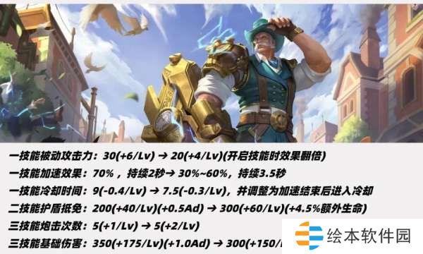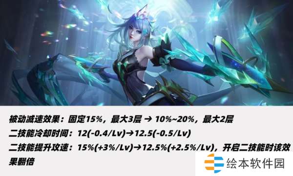 二技能攻速从15%-30%改为12.5%-25%,二技能期间攻速加成翻倍。