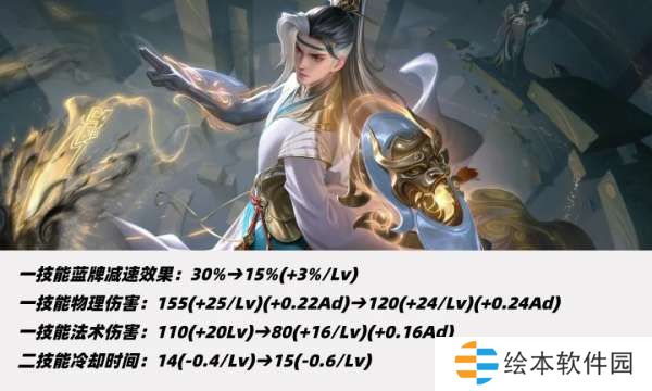 一技能下调50点基础伤害、上调14点等级成长和0.07AD加成,一技能冷却前期不变、满级缩短1秒。