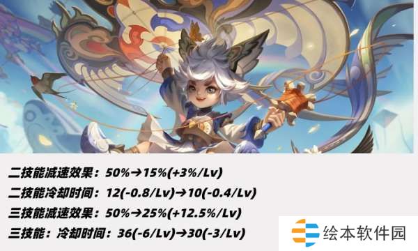 一技能蓝牌减速从30%调整至15%-30%,二技能前期增加1秒、满级不变。
