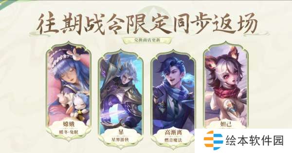 嫦娥-暖冬兔眠、暃-星界游侠、高渐离-燃音魔法和妲己-灵卜魔法,加入战令兑换商店、通过战令币购买礼包获取。