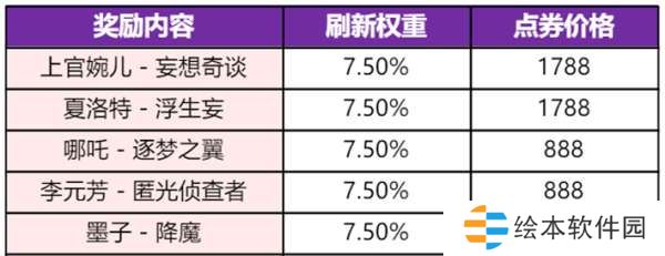 此次加入了五款限定皮肤:上官婉儿-妄想奇谈、夏洛特-浮生妄、哪吒-逐梦之翼、李元芳-匿光侦查者和墨子-降魔。