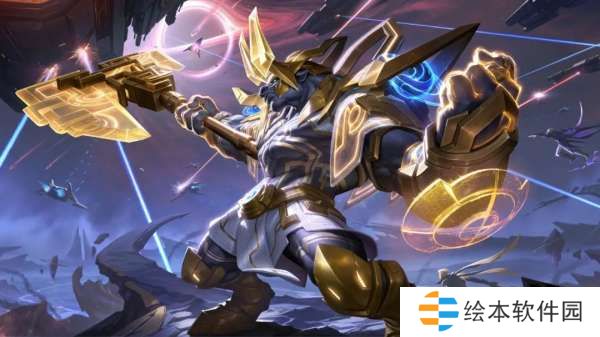 造型设计上牛魔身穿蓝金色铠甲、手握金色巨斧,技能特效融入了金色符文印记、紫色星空能量和战场废墟元素。