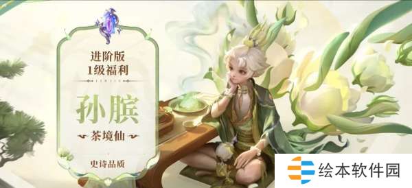 孙膑-茶境仙、品质史诗限定,进阶版战令1级获取,造型设计上孙膑身穿绿色民族服饰,背后是***朵错落排布而成的轻盈翅膀。