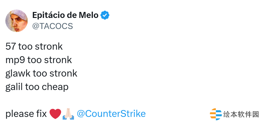 日前巴西老将TACO在社交平台上发布动态,他呼吁V社尽快行动起来,削弱FN57、MP9和GLOCK,同时提高GALIL的售价。