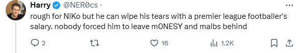 对于NiKo会作何想法,NER0表示:“情况对NiKo来说有点难,但他现在可以拿着接近英超足球运动员的薪水哭泣了,没有人强迫他离开m0NESY和malbsMd。”