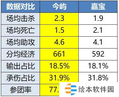 而今屿今晚的对手嘉宝,在小组赛的表现也同样谈不上亮眼,KDA在淘汰赛打野选手里排名倒数第二,参团率也同样是末流。英雄池方面,嘉宝坦野的胜率要明显优于野核,夏侯惇5战3胜,阿古朵2战全胜。至于镜和大司命,一个50%胜率场均1-1.5,一个3战仅1胜。在今晚的BO7里,对嘉宝的英雄池无疑是个巨大的考验。