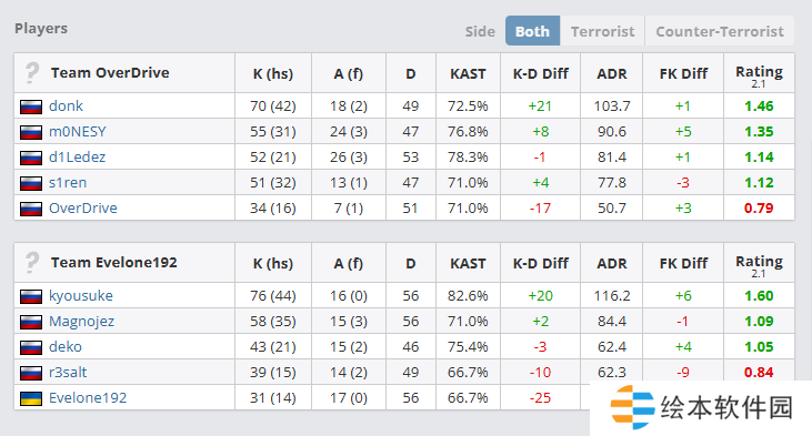 表演赛为BO3。kyousuke即使是在对阵donk、m0NESY,仍拿到了76的最高击杀数、1.60的最高Rating、82%的最高KAST和116.2的最高回合平均伤害。