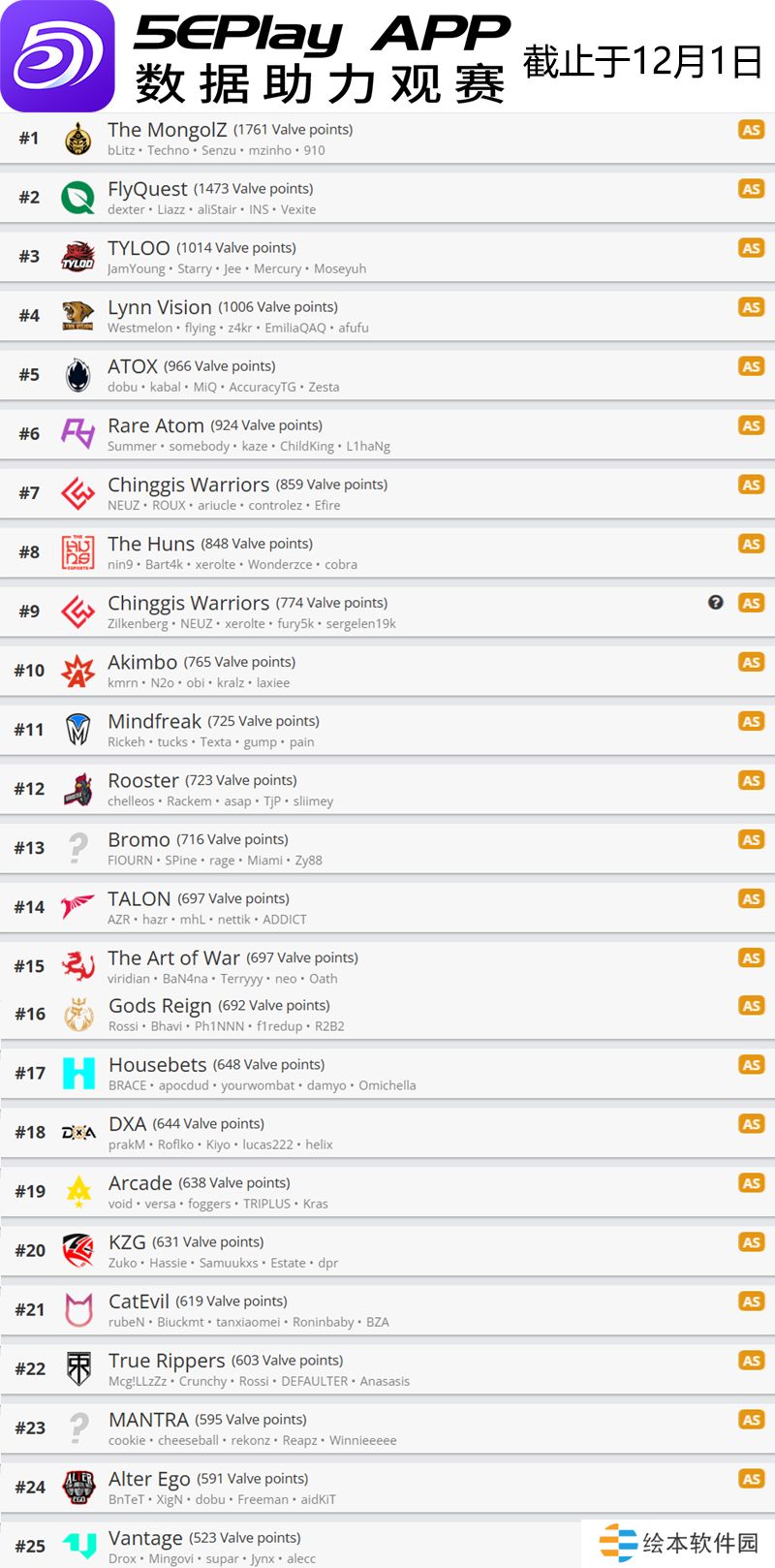 V社世界排名1201:G2第一 The MongolZ第五
