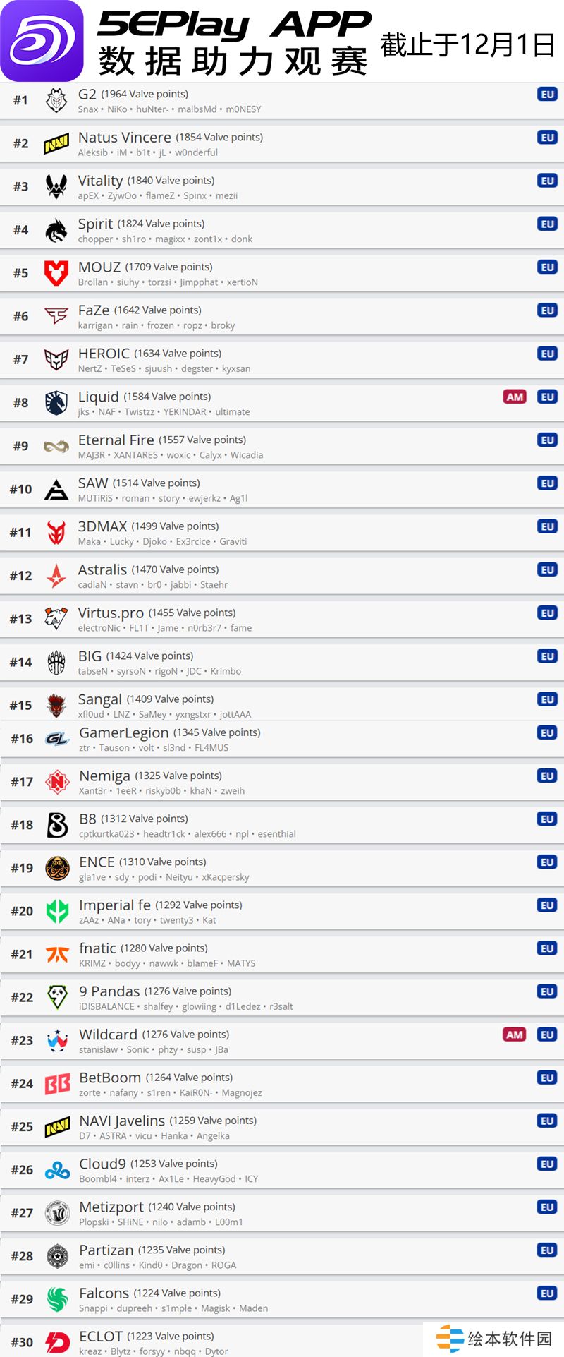 欧洲区前30名如下: