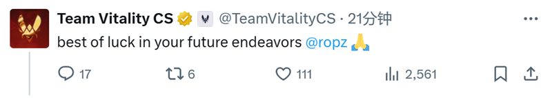 而在评论区中,Vitality俱乐部也回复道:“ropz,祝你未来一切顺利。”