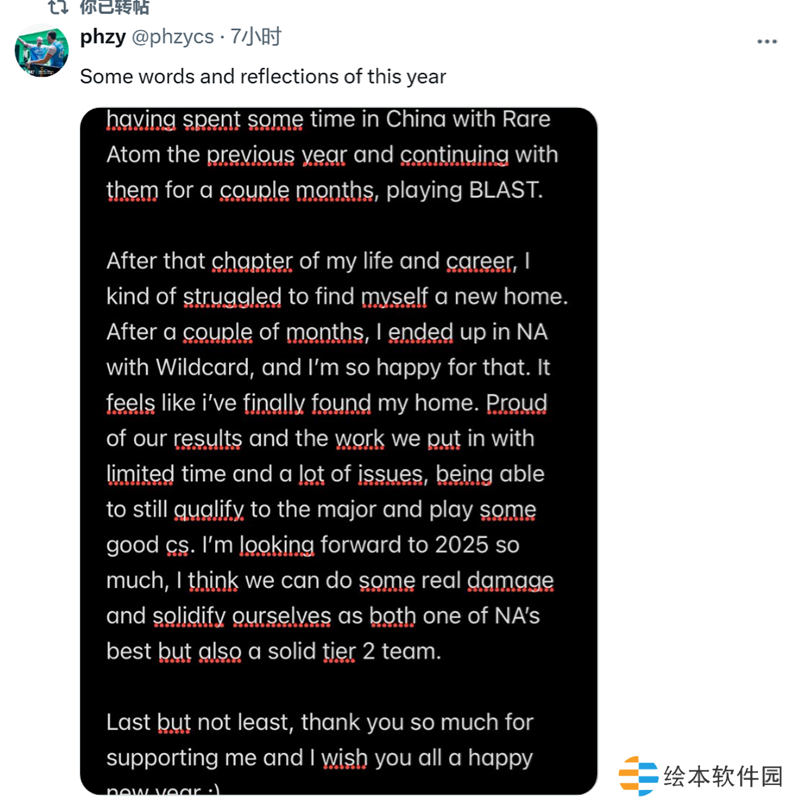 Wildcard战队,对此我感到十分开心。感觉我终于找到了自己的家。我为我们取得的成绩感到骄傲,尽管时间有限且问题重重,我们依然努力付出,成功晋级Major,还打出了一些精彩的CS对局。我对2025年满怀期待,我觉得我们能真正大展身手,不仅稳固我们在北美最佳战队之一的地位,还能跻身实力强劲的二线战队行列。