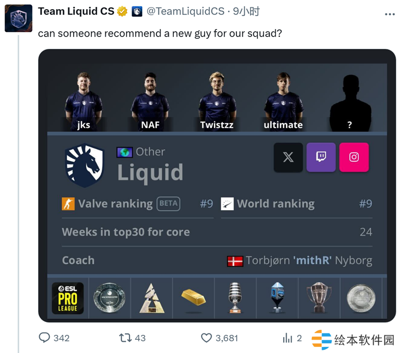 Liquid战队在社交平台上发布动态,向社区求助:有没有人能为我们的阵容推荐一名新成员(a new guy)?