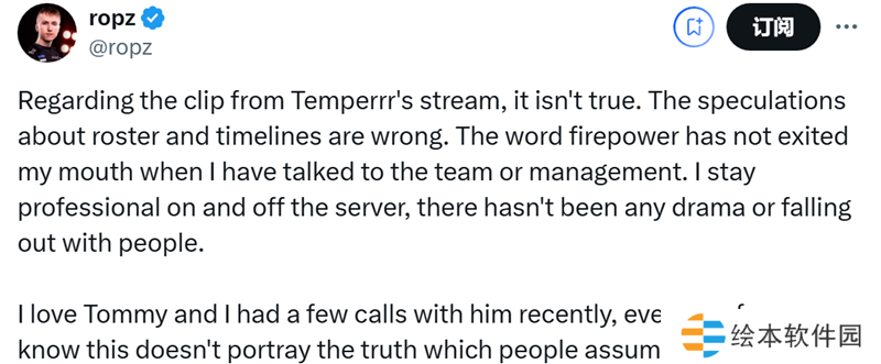 “关于Temperrr直播中的那段视频内容,那不是真的。有关阵容和时间线的猜测都是错误的。我在与战队或管理层交流时,从未说过‘火力’这个词。无论在游戏内还是现实生活中,我都保持专业态度,并没有和任何人发生过矛盾或不愉快。