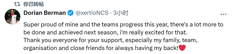 MOUZ战队选手xertioN获此殊荣。随后在社交平台上,他也分享了自己的感受。