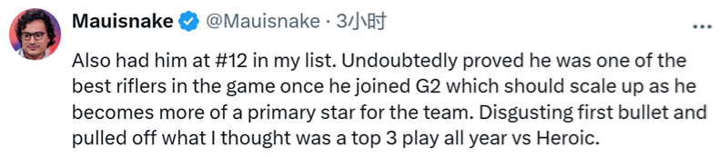 Mauisnake:在我的排名榜单里,我也把他排在第12位。毫无疑问,自从加入G2后,他就证明了自己是游戏中最出色的步枪手之一。随着他在队伍中逐渐成为核心明星选手,他的表现还会更上一层楼。他的首发射击准度惊人,在对阵Heroic的比赛中,他打出了我心目中年度最佳的前三操作。