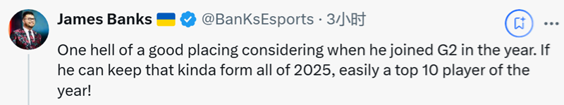 Banks:考虑到他今年加入G2的时间点,这排名相当出色了。要是他在2025年一整年都能保持这种状态,那轻松就能成为Top10选手!