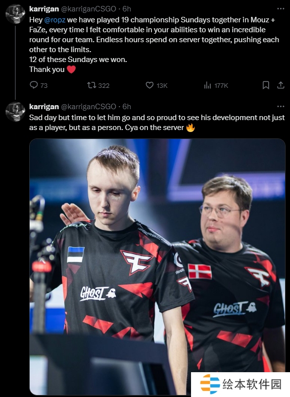FaZe官宣ropz离队后,队长karrigan在个人社交媒体账号上发布动态告别这位曾经在
