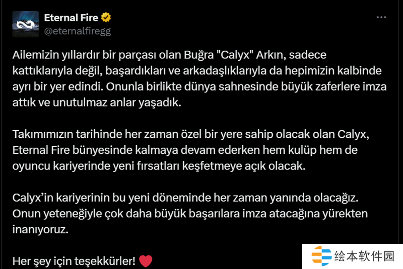 “Calyx多年来一直是我们战队的一员。他在我们所有人的心中占有特殊的地位,不仅因为他为队伍所做出的贡献,还因为他所取得的成就和我们之间的友谊。我们和他曾一起在世界舞台上取得了伟大的胜利,并经历了难忘的时刻。