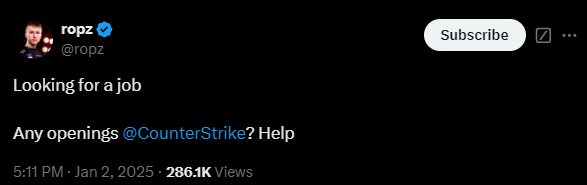 Robin Kool | ropz今日在社交媒体账号上整活求职:“找工作中,@CounterStrike,你们那有空缺的职位吗?求助”