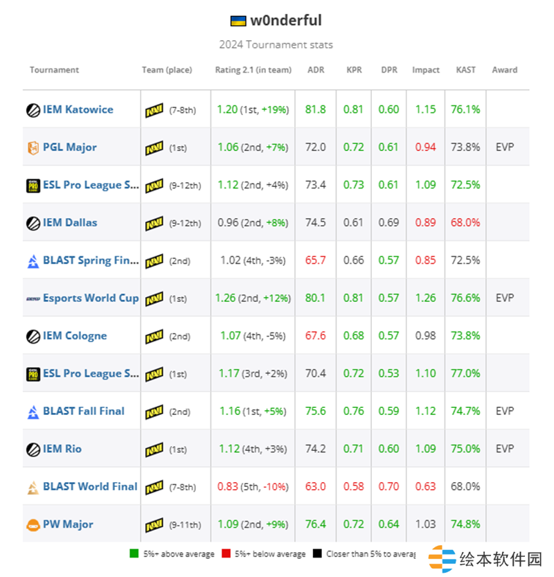 Falcons终结了Natus Vincere的淘汰赛之旅,但w0nderful却没有输。他在首张地图Ancient的失利中又一次创造了无与伦比的表现,在获得110 ADR的同时还获得了1.77 Rating,但他的队伍在最后一张地图上溃不成军,最终以微弱劣势落败。无论如何,w0nderful的1.20赛事Rating、81.8 ADR和0.81 KPR都让他成为了赛事中最出色的选手之一,而他1.15 Impact Rating也令人印象深刻,这在全年的比赛中并不常见。